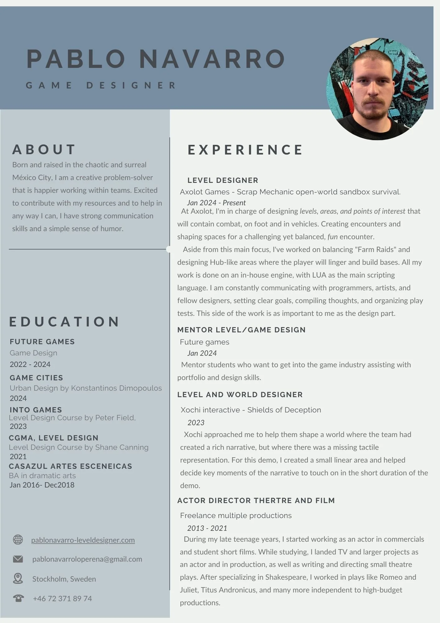 Storytelling is my life, and I’ve looked for ways to tell stories since I can remember. After receiving my Dramatic Arts degree and working in theatre and films, I decided it was time to pursue my biggest passion, Video Games. Even when having a story or a narrative in mind, I'm always focused on the player's experience. This affects how I approach level design, taking a holistic approach that makes me consider every aspect of the game.